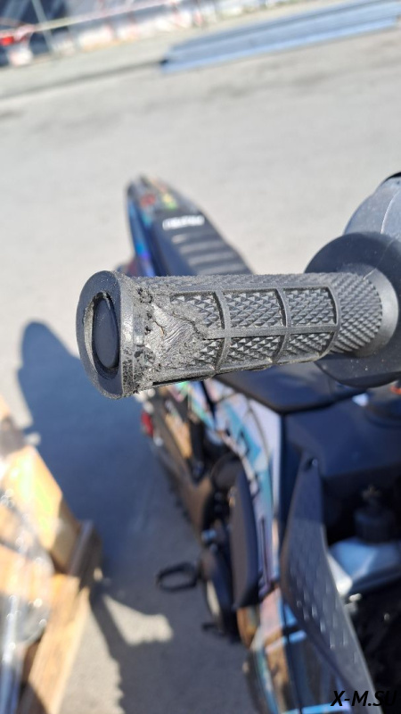 Было падение на правую сторону. Потерт боковой пластик, переднее крыло, немного загнута лапка тормоза. Порвана грипса.